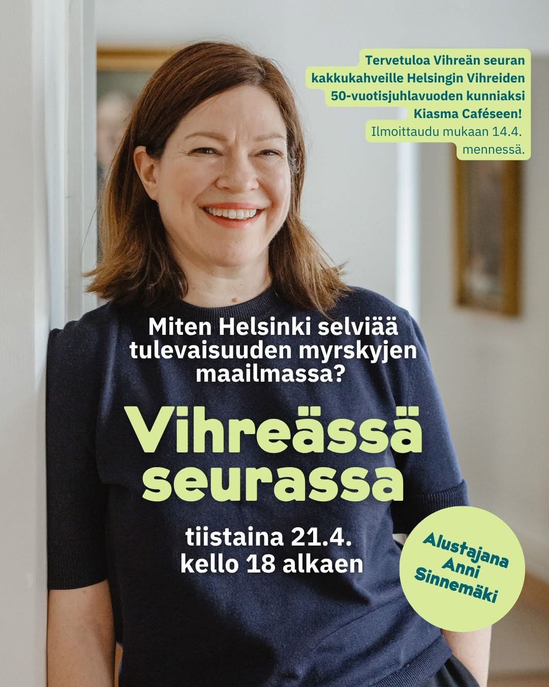 Hei Helsingin Vihreän seuran jäsen! Lämpimästi tervetuloa Helsingin Vihreän seuran kakkukahveille Helsingin Vihreiden 50-vuotisjuhlan kunniaksi! 🟢 Vihreässä Seurassa-ilta alkaa klo 18 Kiasma Caféssa, tiistaina 21.4.2026. Kahveille saapuu kanssamme keskustelemaan vihreää Helsinkiä niin kansanedustajana, puolueen puheenjohtajana, ministerinä kuin apulaispormestarinakin edustanut kaupunginvaltuutettu…